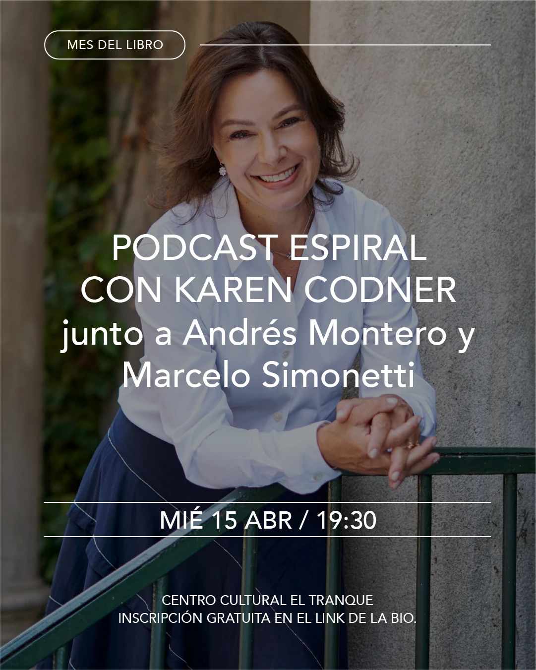 Llegó abril, el mes del libro, y quiero invitarte a dos actividades que no te puedes perder. Primero, te invito a una sesión especial del Podcast Espiral en vivo. En el Centro Cultural El Tranque en Lo Barnechea, conversaré con los autores Andrés Montero y Marcelo Simonetti, dos voces fundamentales de la narrativa contemporánea. Tendremos una conversación de seguro fascinante donde entraremos en sus universos literarios y procesos creativos para el desarrollo de sus obras. La actividad es gratuita, pero con cupos limitados, así que te invito a asegurar tu entrada en el sitio web de la Corporación Cultural de Lo Barnechea: